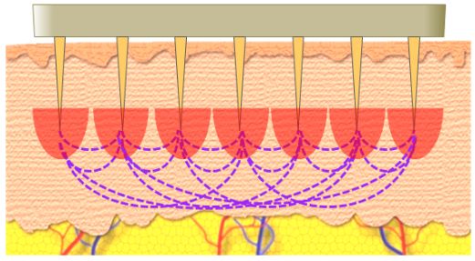 射频(RF)是一种电磁辐射能量,其能量可以电或磁的形式存在并传播。射频治疗是一种非侵入式的治疗方式,它使通过无选择性的加热作用促发短期的胶原纤维收缩和很长时间内的胶原纤维合成,从而减少条索状妊娠纹长度和宽度,达到妊娠纹的改善。