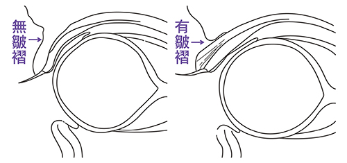 为什么有些人先天是单眼皮,有些人是双眼皮呢?单眼皮的人张开眼睛时没有双眼皮的皱褶(如下左图),上眼皮会盖住眼珠,看起来眼睛小,眯眯眼,像想睡觉的样子(另外一个会让眼睛看起来想睡觉的原因是眼睑下垂,请看本文未段介绍)。有双眼皮的人张开眼睛时会有双眼皮的皱褶(如下右图),上眼皮不会盖住眼睛,看起来眼睛当然比单眼皮的人大。