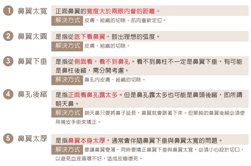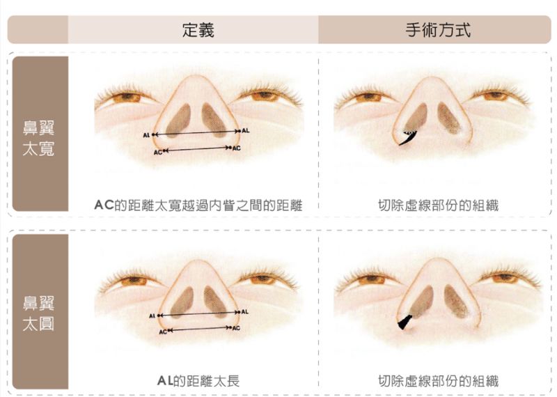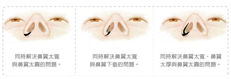 以往鼻翼手术效果不好的原因在于只着重于皮肤的切除、加上鼻翼周围的肌肉都会将鼻翼往外拉扯,更减少了缩鼻翼的效果。因此,鼻翼下肌肉的重新定位才是手术成功的要素。