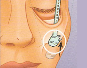 在脸部的大阳穴附近的发际内切一条约2到3公分的切口,然后再切口外的下方约三公分处在切开进入皮下筋膜,然后藉由筋膜的拉力就可把下垂的眉毛眼角向上拉起,并配合内视镜的辅助,出血少、伤口很小而且疤痕隐藏在发际内。