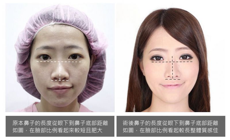 此案例原本鼻子山根的起始点大约在眼下处,手术后将其起始点调到与眼部同高,整体的比例拉长质感提升。