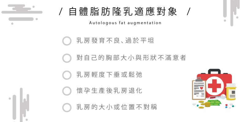自体脂肪隆胸手术适合有大小奶问题的对象、或是想增加的罩杯尺寸大概在1~1.5CUP内的需求者,因为自体脂肪增加罩杯的尺寸是有限的评美帮。此外,自体脂肪手术较不适合太过纤瘦、体脂肪过低的女生,因为较瘦的女生没有多余或足够的脂肪能够做抽取。