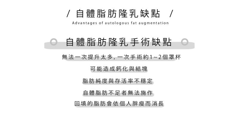 由于是自己的脂肪,因此安全性极高、不会有排斥的问题且不会有副作用。然而也不会有不自然或荚膜挛缩的问题。而缺点就是因为身体会自行代谢,因此通常注射进去的脂肪只有一部分会被吸收,所以在一次的手术下想要增加的罩杯尺寸是有限的,但那些被吸收的脂肪在没有变瘦的情况下是会永久存在的。
