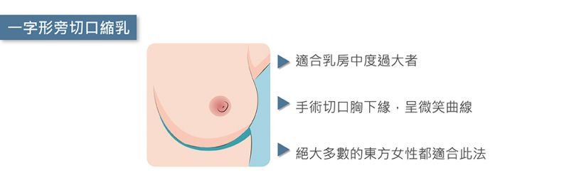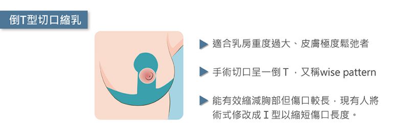 绝大多数的受术者都适合一字形切口缩乳(微笑型切口)手术,但极少数乳房极大如巨乳症患者,或是皮肤因此松弛多余的女性就必须利用倒T切口缩乳手术才能做改善。