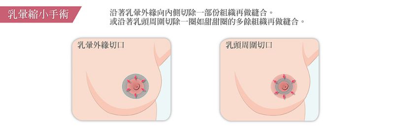 手术方式是沿着乳晕外缘向内侧切除一部份组织再做缝合,或沿着乳头周围切除一圈如甜甜圈的多余组织再做缝合。