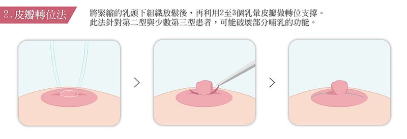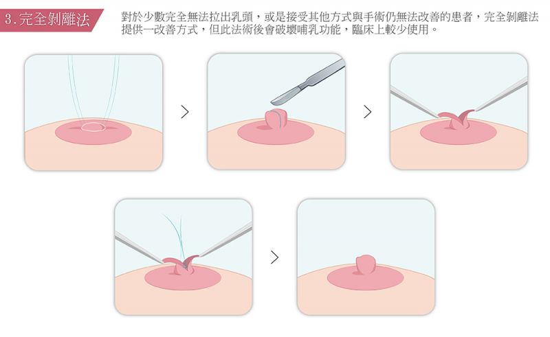 轻微的乳头凹陷可以透过物理刺激如自行拉提乳头运动或乳头负压吸引等做预防与治疗,中度以上就需要接受矫正手术治疗,将部分紧缩的泌乳管与系带切除,借此松解乳头向下的牵扯力量评美帮,使乳头重见天日,并依乳头下陷的程度作不同的皮瓣处理或上提。