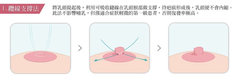 轻度凹陷患者可以通过手法或吸奶器牵拉,手术的部分可以选择以缆线支撑法来做改善,优点是不影响哺乳、手术微创,但是不适合第二型以上的患者,否则乳头凹陷复发率较高。