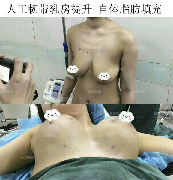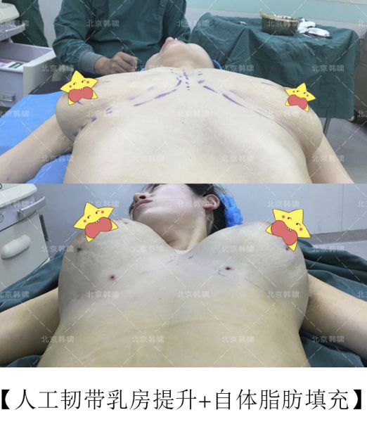 传统手术方式破坏乳房生理结构,术后乳房状如败絮、毫无弹性;人工韧带乳房上提术,将乳房提拉收紧到原有生理位置,使乳房恢复半球形的、坚挺的青春自然外观和紧实、弹性的手感。