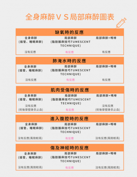 目前麻醉的方式可简单区分成局部、静脉、全身麻醉等几种,为了要让诊疗者进入深沉熟睡,以利医师进行抽脂,许多医师会使用全身麻醉,并且做插管以利麻醉医师控制其血氧浓度。而全麻一般则需交由麻醉科医师来进行,当然也有部分业者为了省成本,而交由医美医师、麻醉护理师来执行。而静脉麻醉是利用药物让诊疗者进入深沉熟睡,但是并没有做插管的动作,所以呼吸道的风险反而是比全身麻醉来得高。