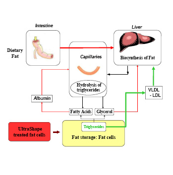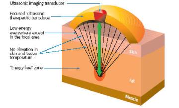 当皮肤接受超声波的能量时,会在皮下脂肪层产生一个物理性的热破坏效应,引起脂肪细胞及组织的细胞膜分解破裂,这种破坏造成脂肪的直接分解,同时引起微发炎反应,脂肪的生理被破坏后产生一系列的脂肪代谢溶解。