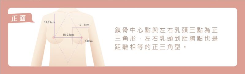 锁骨中心点与左右乳头三点为正三角形,左右乳头到肚脐点也是距离相等的正三角型。
