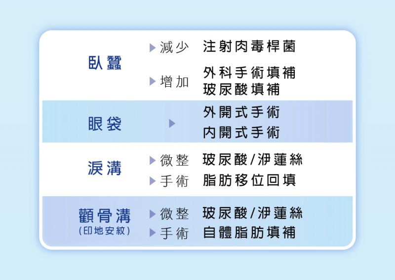 ● 眼袋:因眼周韧带筋膜松弛、支撑力不足,导致脂肪被眼球挤压所形成的区块浮肿袋状物。