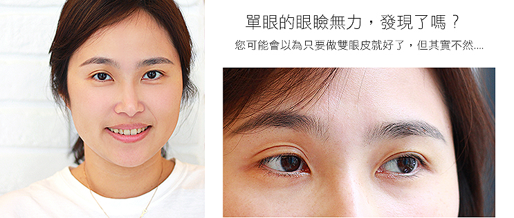 先看左图,您可能觉得这位女生,只是一眼单眼皮、一眼双眼皮而已,完全不看不出来有「眼睑无力」的症状。其实这案例的「右眼」有轻微的眼睑无力,为了平衡视野,需要靠用力提眉方式来代偿肌肉的无力,所以在长期下就会形成高低眉、眉眼距离落差的状况,同时,双眼皮折痕也会容易过高、多层或不易形成。
