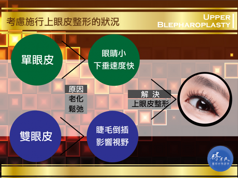 除此之外,有的人眼皮脂肪先天缺少甚至萎缩,变成有上眼凹的现象,或有眼睑下垂变成两边大小眼的情况,也都必须借助眼皮手术做矫正。