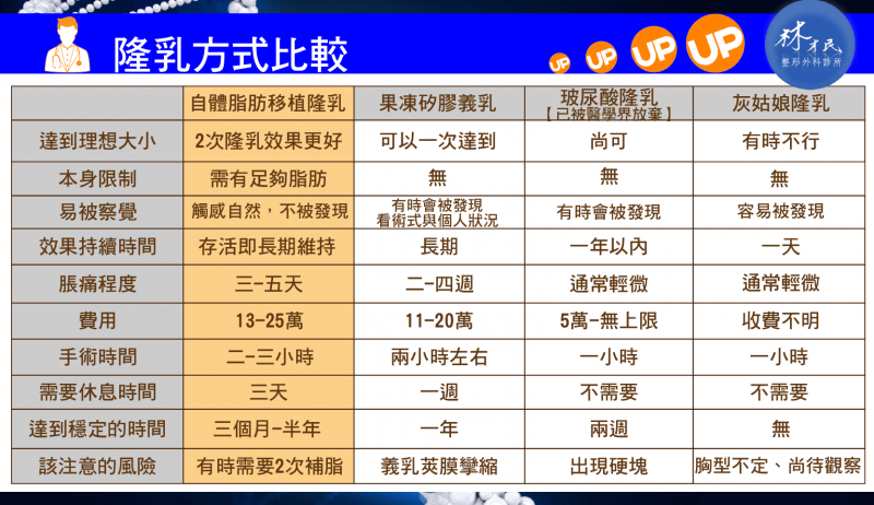 至于要如何评估适合自己的隆胸方式,得先理解四种方式的特征。实习医师小编帮大家整理了一个表,让各位秒看懂隆胸方式的差异。