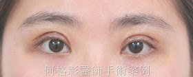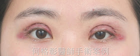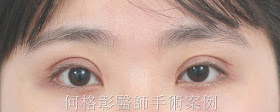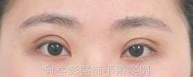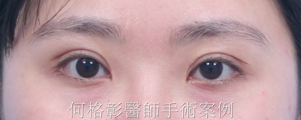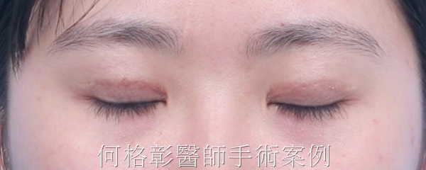 个案约2年前在他处做过双眼皮手术,术后双眼皮过高太宽,显得无神,且左右不对称,经详细的术前评估,双眼皮设计高度右侧为9.5mm,左侧为9.7mm ,且左侧有发生高位沾黏造成眼睑下垂,皮肤已经在第一次切除过,无多余的皮肤,所以无法将原本的旧疤痕切除,我在其下方约7mm的高度设计一新的双眼皮线切开,采取双平面剥离技术,向上剥离疤痕组织,使原有的双眼皮线彻底消失,并且松开皮肤和提眼肌筋膜之间的黏合,重新将下皮瓣固定在较低处,最后将眼眶脂肪下拉,可以避免重新沾黏或三眼皮的形成,有些情况是先前移除过多脂肪,则可能必需拿取身上别处的脂肪进行脂肪移植。