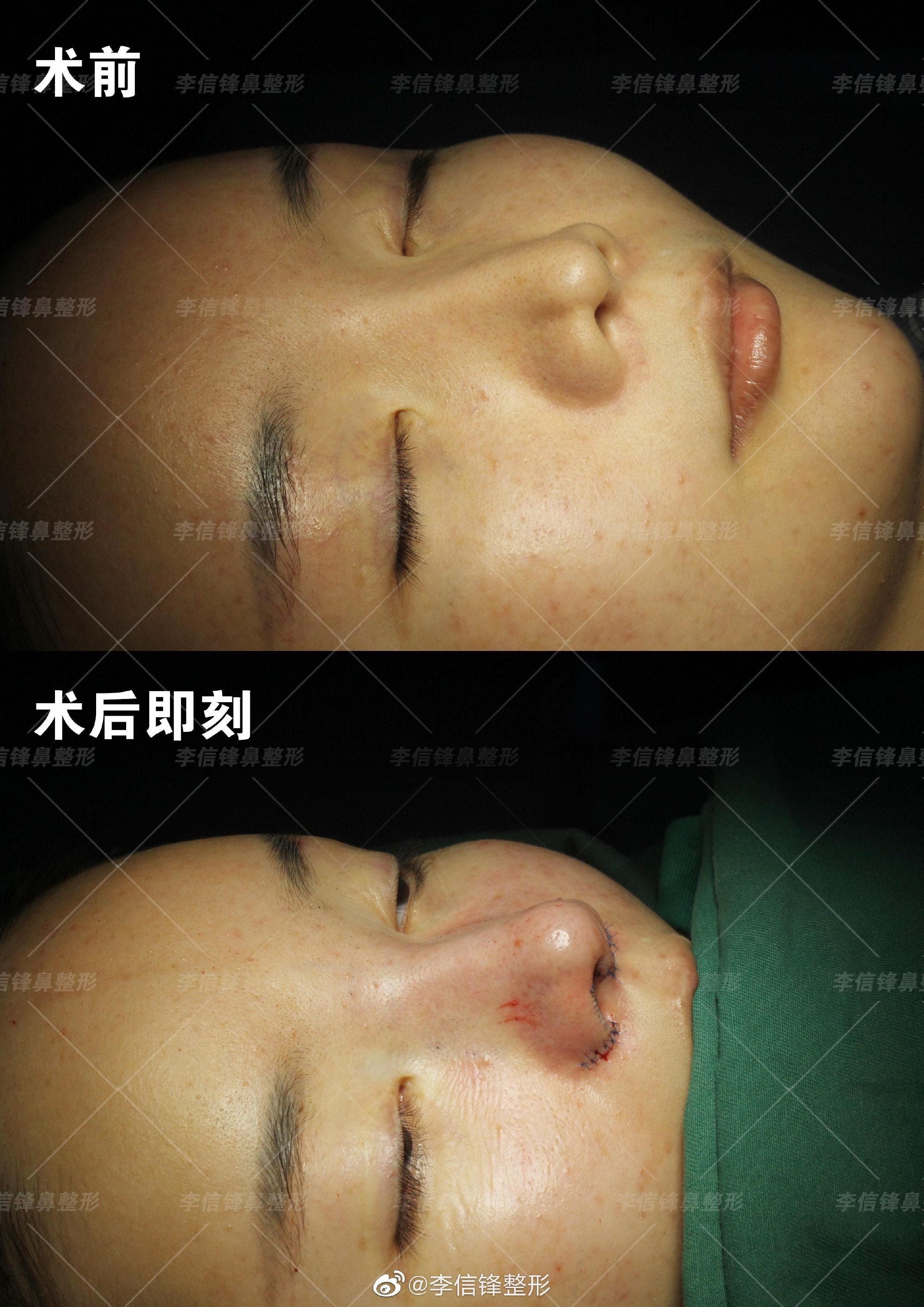 【手术方案】取出原有假体材料,肋软骨支架重塑鼻尖、鼻小柱偏曲矫正、歪鼻矫正、鼻翼缩小改薄、鼻小叶加饱满、鼻头塑形,鼻梁膨体置换、鼻中隔重建等,术后即刻。
