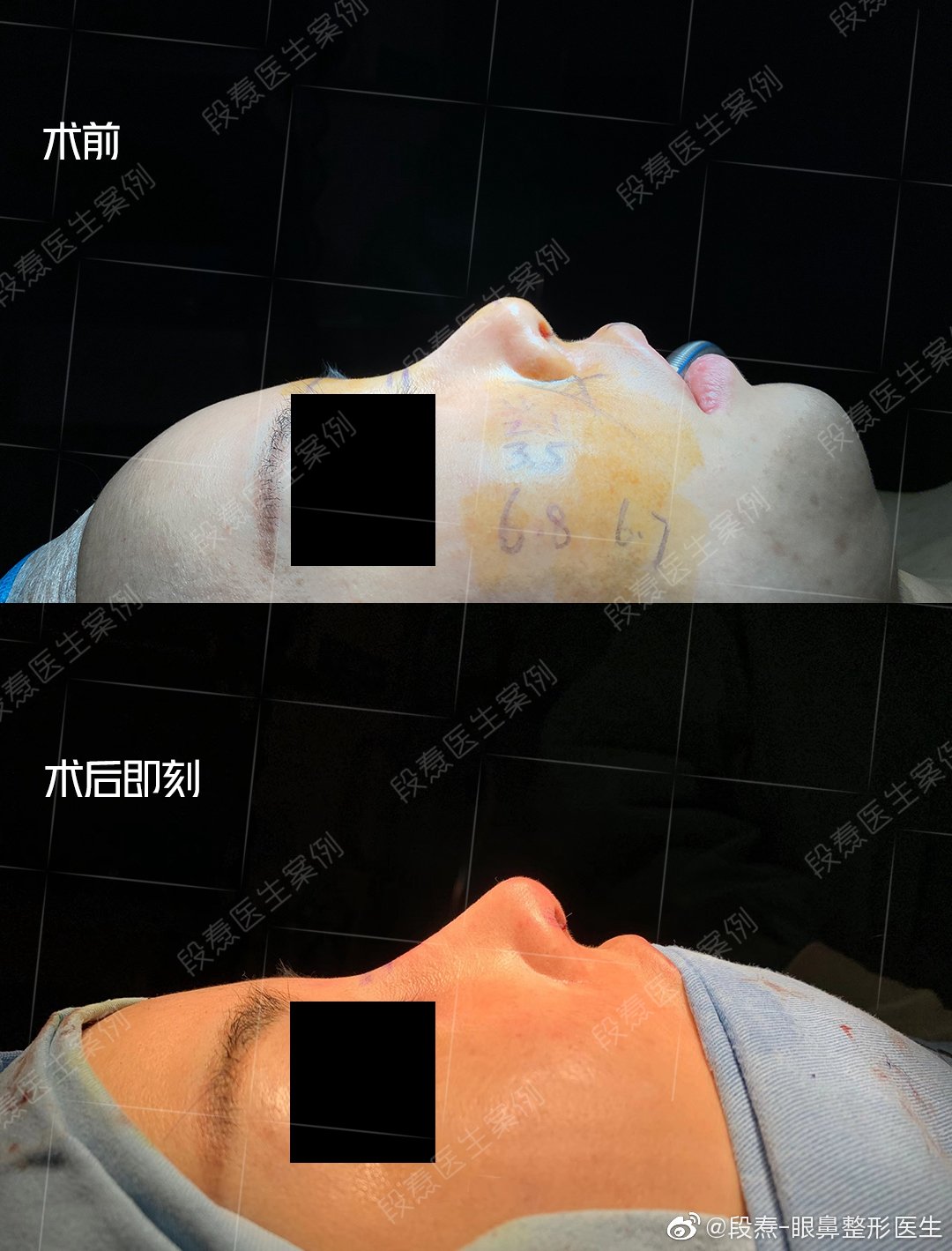 顾客很多年前做过硅胶隆鼻,术前鼻体较短,朝天,并有一点歪,鼻头圆钝,鼻翼肥大,经过肋软骨综合隆鼻修复改善后,术后即刻效果,鼻子长度得以延伸,比例更加和谐,鼻型精致自然,立体挺翘,是顾客想要的感觉,期待后续恢复反馈。