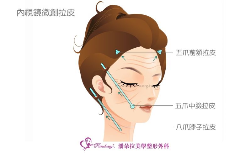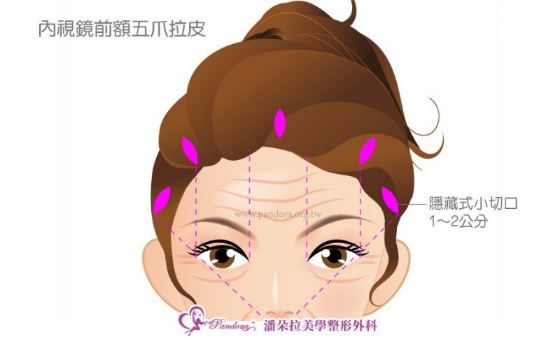 1.上脸:指的是前额拉皮,透过前额头发内五个1~2公分的小切口,藉由特制的内视镜器械、剥离器,去完成以往传统拉皮30公分切口才能完成的前额拉皮术,将抬头纹、眼皮眼角下垂及三角眼往上拉提,再利用五爪钩将松弛的皮肤固定在前额的骨头上,能将眉毛大幅提高,将眼皮下垂盖住的内双双眼皮露出来,会看起来比较有精神,不须切除多余的皮肤,因此伤口小、恢复快、几乎看不到疤痕,效果可以维持5~8年。