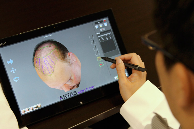 透过电脑设计,机械臂也可在植发区做紧密的小切口,度身设计新加毛囊的分布位置。再经由植发针管将毛囊分布均匀在少头发的区域,如两边髪缐、前额、头顶或眼眉位置。