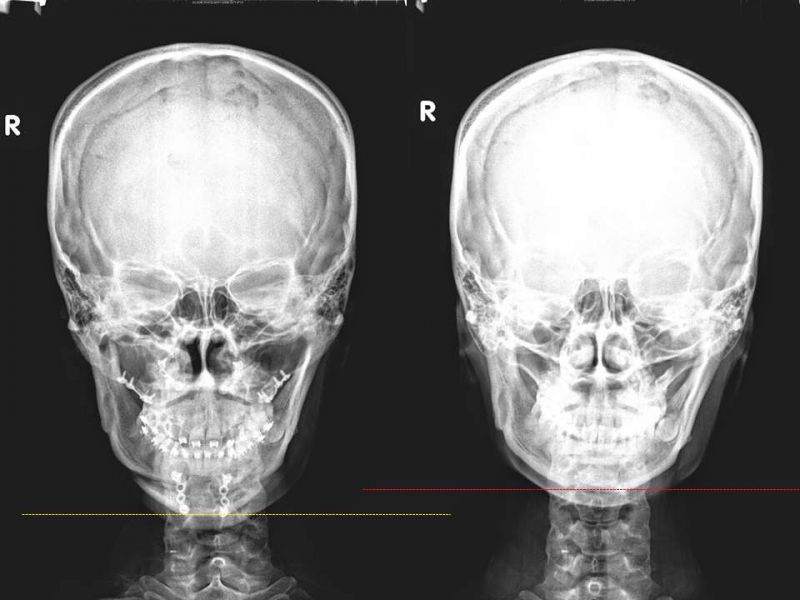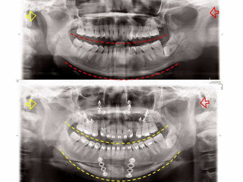 下图影像可以看到两侧的颞颚关节有明显不同(黄色箭头较小为异常侧,红色箭头较大为正常侧。上图红色箭头所指处是因对焦模糊所以形状改变) 手术本身并没有造成关节附近的骨骼、肌肉改变,但是对牙齿的排列弧度以及脸部轮廓的影响可以由上下图中的弧线比较得知,微笑曲线也同时改善。
