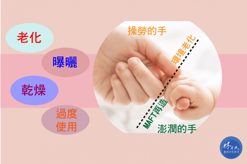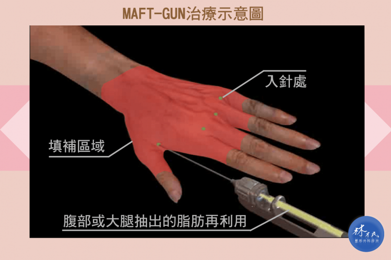 MAFT是精微自体脂肪移植术(Micro-Autologous Fat Transplantation)的简称,利用精微自体脂肪移植来达到玉手回春的效果可说是最安全、无排斥疑虑的现代医学。精微自体脂肪移植术,顾名思义就是取自己身上的脂肪,大部分是腹部及大腿处,经过萃取精致化后,再植入手背,将脂肪小心翼翼地、精准地铺陈在手部的每一个环节处。而植入的脂肪体积单位极小(甚至比芝麻粒还小),有益于脂肪球团的营养吸收与代谢物排除,脂肪存活率相对提高。最重要的是将自己身上多余脂肪(废油)recycle再利用,安全无排斥性,可说是一举数得。〈奶油桂花手形容手指与手盘圆润饱满,不须操劳于家务事的富贵人家。〉