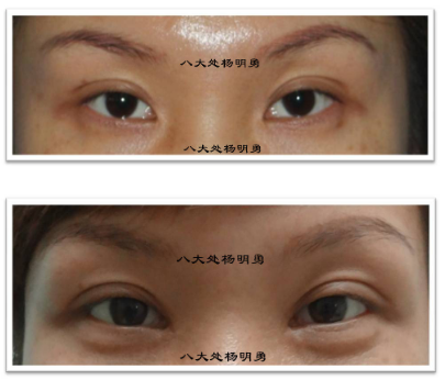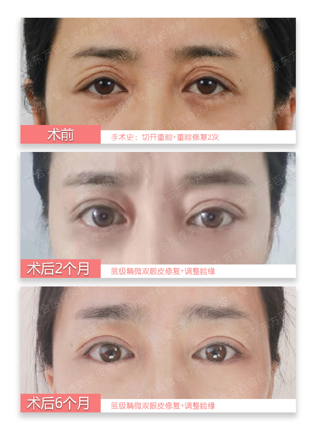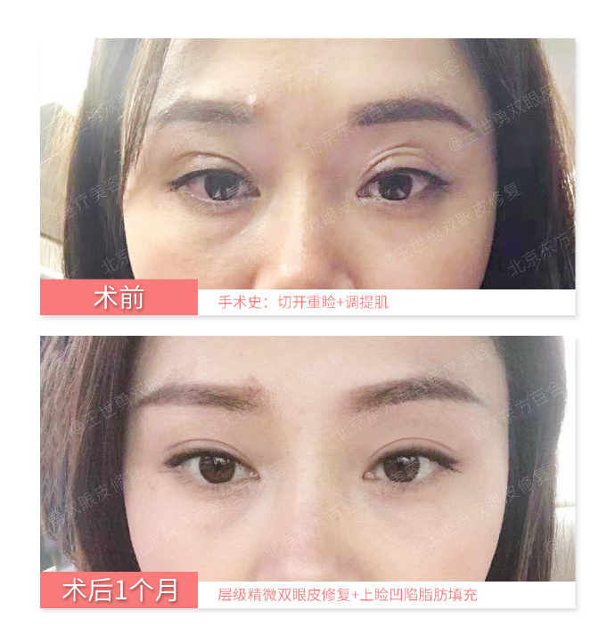 王世勇眼修复案例:姑娘之前做过一次切开双眼皮+调整提肌,修复前上睑组织去除过多,造成上睑黏连,凹陷会使人显得老气不精神;解决这一类问题手术的关键是: 隔离黏连,建立上睑的滑动性,加强动力系统,以及还原组织和组织之间的协调比例关系,这样才会使曲线,宽窄,形态协调,术后显年轻。