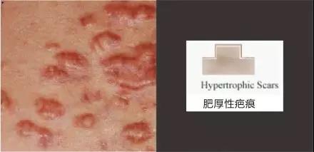 增生性疤痕:当时伤口可能损伤了真皮深层,疤痕明显高于周围正常皮肤,局部增厚变硬。在早期因有毛细血管充血,疤痕表面呈红色或紫色。在此期间,痒和痛为主要症状,甚至因为搔抓而致表面破溃。于环境温度增高、情绪激动或食辛辣刺激食物时症状加重。增生疤痕往往延续数月或数年后,才渐渐发生退行性变化——充血减少,表面颜色变浅,疤痕逐渐变软、平坦,痒痛减轻以致消失,这个增生期的长短因人和病变部位不同而不同。增生性疤痕有时虽厚达2厘米以上,但与深部组织粘连不紧,可以推动,与周围正常皮肤一般有较明显的界限。