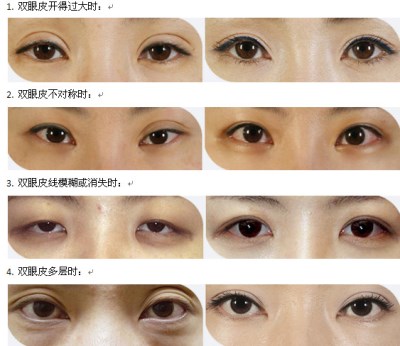 双眼皮过宽过深、左右双眼皮不对称、睁眼费力僵硬、眼皮上疤痕凹凸不平消不掉、弧度不流畅、睁眼闭眼都是双眼皮等等,统称为失败。