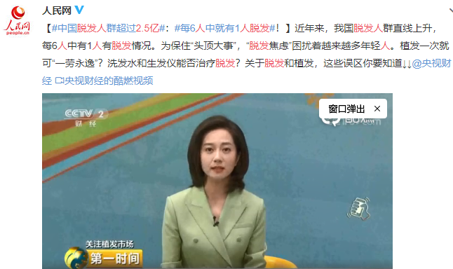 微博超话 #2亿中国人受脱发困扰# 上了热搜。今天人民日报发起的超话#我国脱发人群超2.5亿#再次刷起热搜新高度。