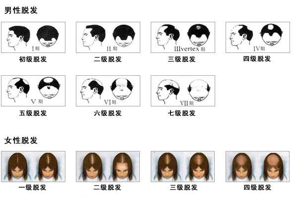 女性一级脱发为正常头发;二级脱发中分处看到少许头皮;三级脱发中分处看到明显头皮裸露;四级脱发中分处头皮范围扩大;五级脱发中分处周边稀少范围扩大;六级脱发,头顶形成马蹄状的脱发带;七级脱发马蹄状的脱发带范围扩大。