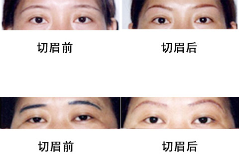 切眉术是将眉毛及周围的皮肤部分切除,重塑新的眉形,可同时改善眼上部皮肤松弛。术前在原不良文眉的部位先设计一个新眉形,依据求美者认可的眉形,设计好的曲线为手术刀路,术后在设计好的眉形上,根据自己喜欢的颜色实施绣眉,因此外观上没有手术痕迹而获得较理想的眉形。