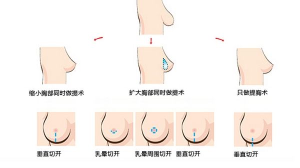 常见方式有:双环法乳房上提术、垂直切口乳房上提术、倒T切口乳房上提术。