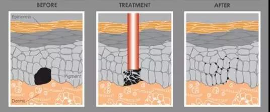 利用选择性光热作用,将能量在短时间释放出来。色素团瞬时间吸收了高能量激光后、迅速膨胀破裂成小颗粒,被排除体外。从而达到净肤、美白、极致年轻化的效果。