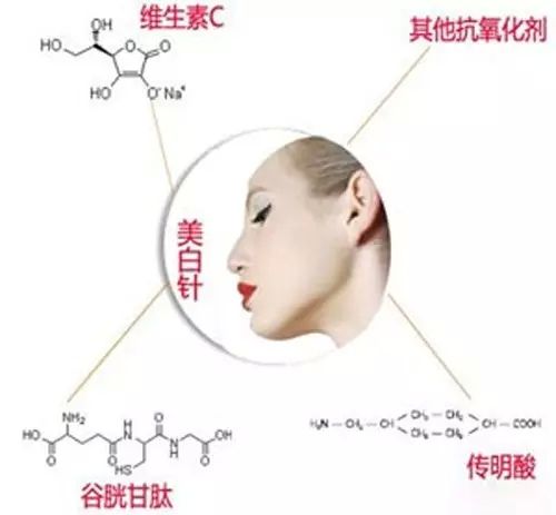 美白针中含有传明酸、谷胱甘肽、维他命C,能够分解人体肌肤中的各种不利色素,如黑色素、黄色素等,并且能够有效修复已受损的美白细胞,使人体中的美白细胞重新恢复活力,同时还能够改善肌肤暗哑、粗糙等问题。