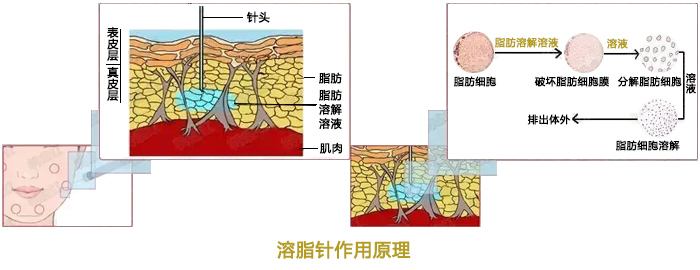 溶脂针的原理是通过注射于皮下脂肪层,打破脂肪形成和自体溶解的动态平衡,刺激局部脂肪内的脂肪酶数量增加,促进脂肪的活化而分解成细小状态,随着身体的新陈代谢由淋巴系统排出体外,效果快速又简单。