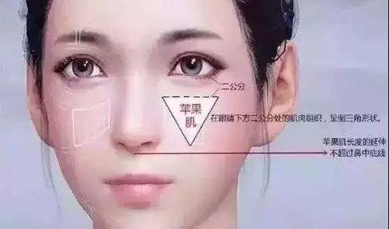 苹果肌并不是肌肉(99%的仙女都不晓得),主要是颧骨前的脂肪组织,“苹果肌”的位置是在眼睛下方二公分处呈倒三角状的组织,微笑或做表情时会因为脸部肌肉的挤压而稍稍隆起,看起来就像圆润有光泽的苹果,得名“苹果肌”。