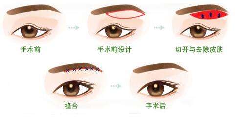 2、对于重度上睑下垂,采用额肌瓣止点下移术矫正。