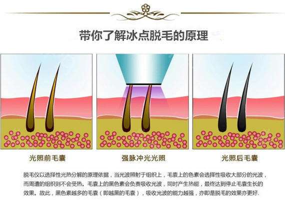 冰点脱毛是目前最先进的一种永久性脱毛方法,依据选择性光热作用原理和冰点半导体激光脱毛仪器,激光穿透皮肤表层使毛囊保持一定温度,温和地使毛囊和周围干细胞失去活性,达到永久脱毛的目的。