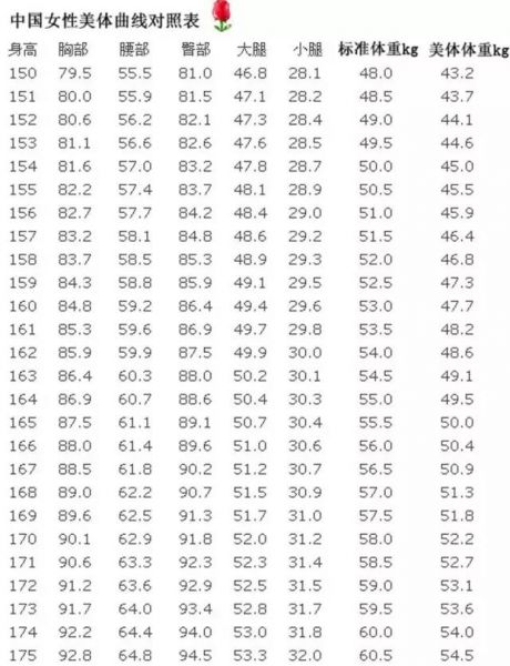 据最新“中国女性美体曲线对照表”显示,身高160,体重要在47.7kg,大腿围在49.4才算达标,请对号入座,看你的身材达标吗?