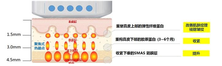 超声刀利用高声频谱穿透皮层直达3~4.5mm,深至浅肌肉筋膜组织SMAS上(人体骨外面的筋膜层),并将高频震荡组织所产生的热能聚焦在一点,从体外使体内的SMAS层热凝固,产生拉紧并提升,达到筋膜悬吊拉皮的效果。