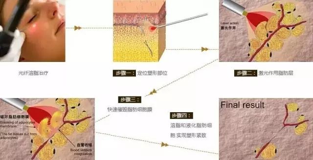 它是利用等离子光热溶解理论,运用光纤作为皮下的热传递方式,导入激光能量,溶解皮下筋膜层及浅层脂肪,并刺激皮下胶原蛋白重新粘连,最终达到塑形与收紧皮肤的双重效果。