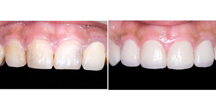 3、龋蚀致切端缺损或牙体表面浅在性大范围龋蚀,用复合树脂修复不牢固且色泽与真牙一致;