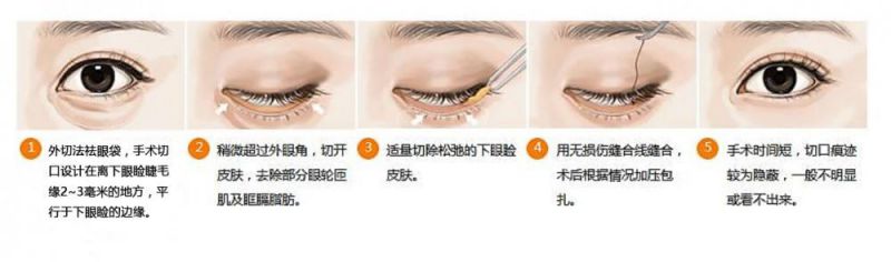 外切祛眼袋切口一般设计在离下眼睑睫毛缘2-3毫米的地方,平行于下眼睑的边缘,稍微超过外眼角,切开皮肤,去除部分眼轮匝肌及眶膈脂肪,适量切除松弛的下眼睑皮肤。