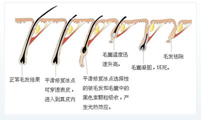 比基尼线脱毛是依据激光脱毛术的光热作用原理,通过合理调节激光波长、能量、脉宽,激光便能穿过皮肤表层到达毛发的根部毛囊,毛囊、毛干的黑色素选择性地吸收光能,由此产生的热效应使毛囊坏死,从而使毛发失去再生能力。