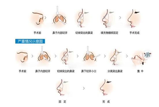重度驼峰鼻的手术方法是去除驼峰组织,包括鼻中隔软骨、鼻侧软骨、整个鼻骨的背侧,然后按照要求缩窄鼻根部,获得较好的鼻部形态。