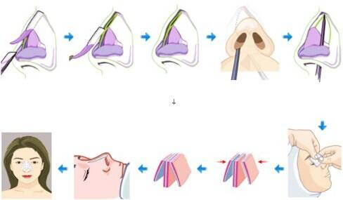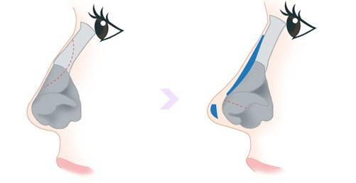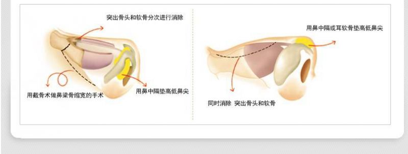 鼻子整体上不高或不大的情况下,如果是在鼻梁中间有点突出的鹰钩鼻只需要将凸出来的部位用磨或削的方法就可以有效地矫正。但如果在不是鼻中部高,而是鼻尖和鼻根部鼻梁相对低而鼻梁显得突出时,不仅需要削掉突出部分,还需要同时进行提高低鼻尖和垫高鼻根部。