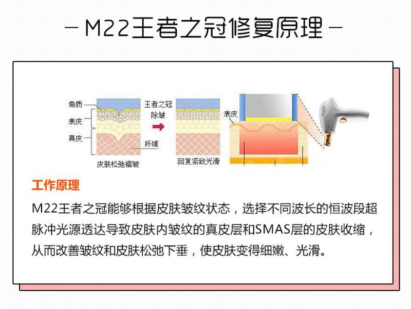 M22王者之冠是目前先进、安全、非侵入式的光子美肤设备;其拥有的四大核心技术,能一站式解决多种肌肤问题,一方面可消除表皮中的色素斑和细小扩张的红血丝;另一方面可深入真皮胶原,刺激胶原增生,抑制皮脂腺(油脂腺)分泌,使皮肤弹性增加、消除细小皱纹等。
